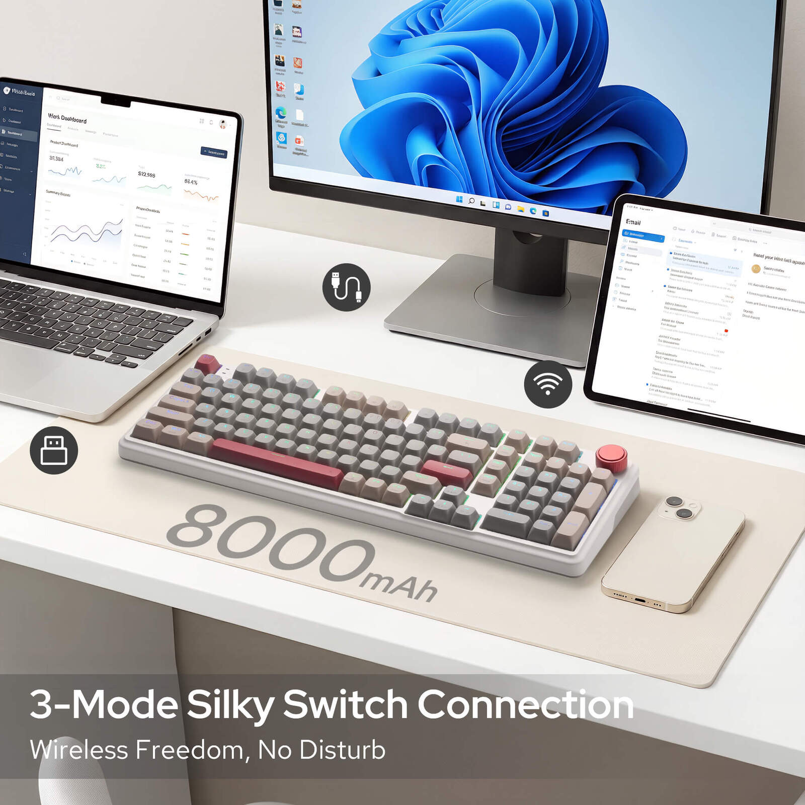 Geared with Redragon advanced tri-mode connection technology, USB-C wired, BT 3.0/5.0 & 2.4Ghz wireless modes and powered-up massive 8000 mAh battery which make the user experience upgraded to another level in all fields