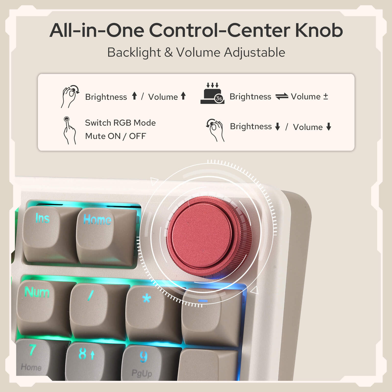 Armed with a convenient easy access control knob, the keyboard backlight brightness and media (volume, play/pause) are all in control with no hassle. Plus functionary with no extra keys or space to waste