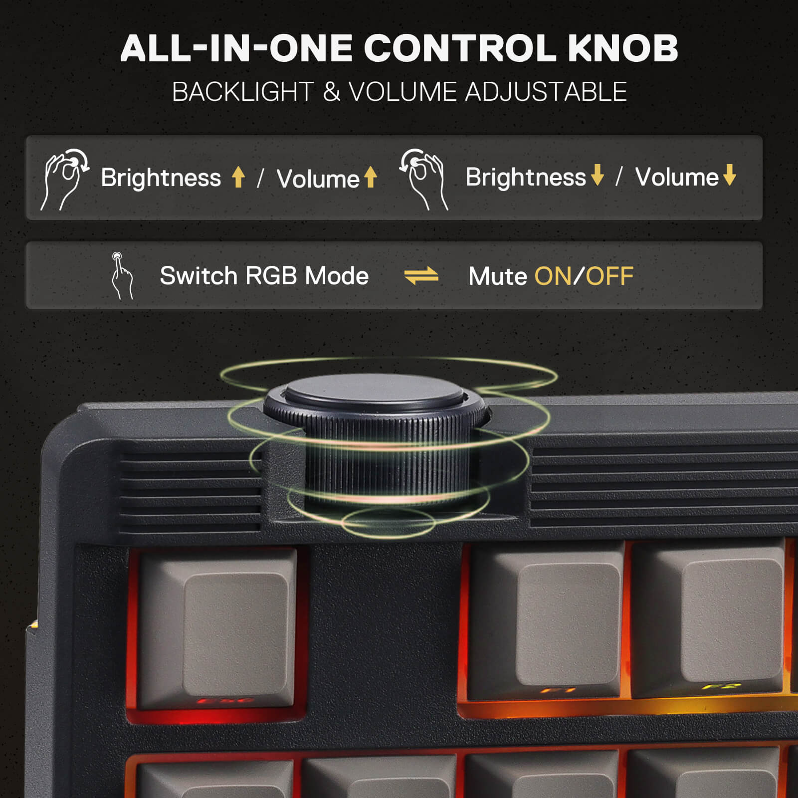 Armed with a convenient easy access control knob, the keyboard backlight brightness and media (volume, play/pause, switch) are all in control with no hassle. Plus functionary with no extra keys or space to waste.