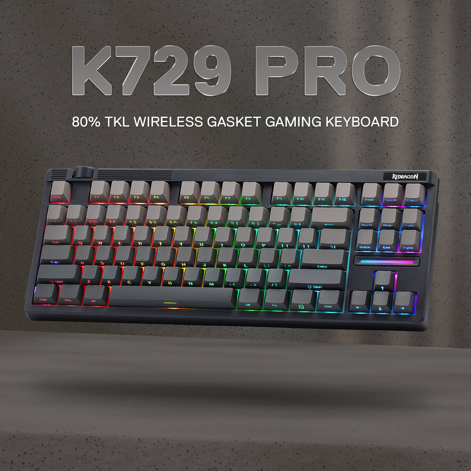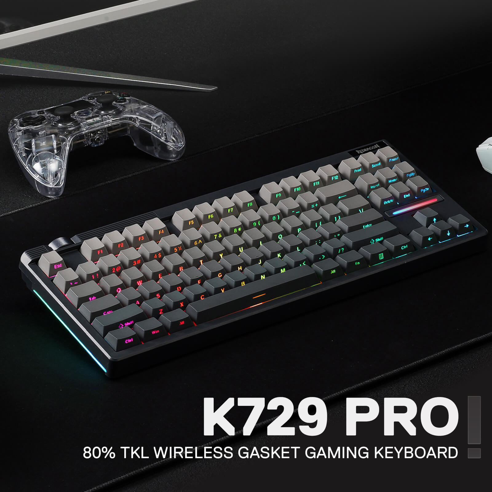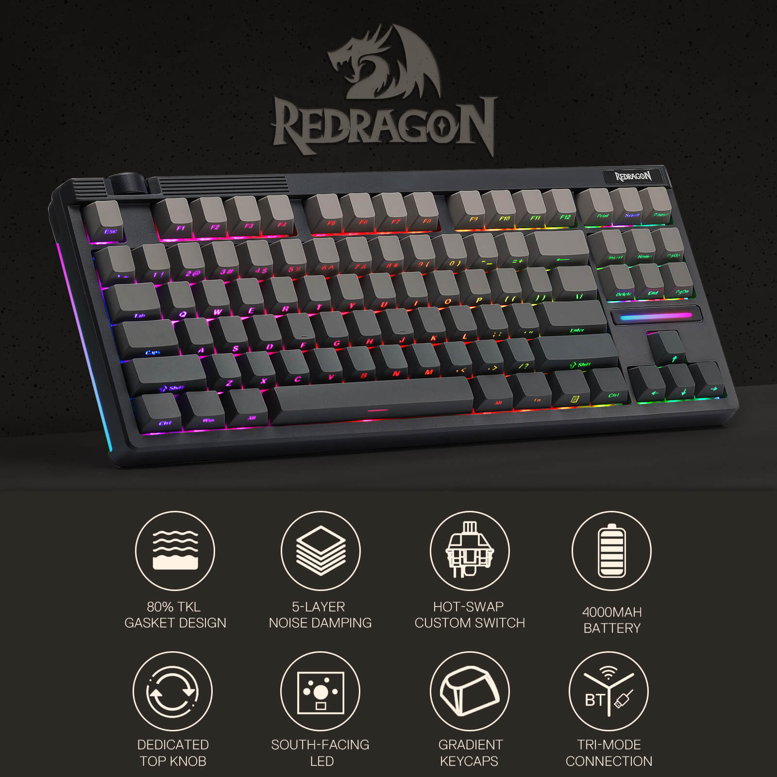The FIRST Redragon silent custom switch launched in the keyboard. Combined with the gasket structure, which features a cushioned, creamy and silent typing feel. Extra added LED lens makes the south-facing RGB light more epic.